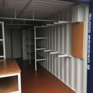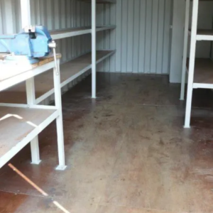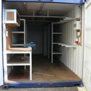 Ausgestattet mit Werkbank, Regalen, Staufach und Elektroinstallation ist der Werkstattcontainer die perfekte Lösung für temporäre oder dauerhafte Arbeitsräume. Dieser Container ist zum Kauf oder zur Miete erhältlich.